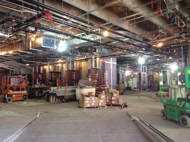 The building is still a work in progress. Men and women in hard hats walk the raw concrete floors where shoppers will meander come summer. Visible ducts and wires run along the ceiling and a stack of pipes obscures a wall that will be covered in a cascade of flowers. The banks of floor-to-ceiling windows that line the front of the building are covered in colorful posters that promote the coming market and prevent passers-by from peering in at the unfinished space.